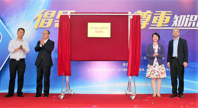 4月20日上午,江门高新区知识产权服务联盟(以下简称“联盟”)揭牌及签约仪式在江门高新区顺利举行。三环江门分公司作为联盟理事长单位应邀参加本次活动,郝传鑫总经理作为公司代表出席活动,并与广东省知识产权研究与发展中心(广东省知识产权维权援助中心)副主任陈宇萍、江门高新区管委会副主任柯杰兵、江门江海区副区长庞晋山共同为联盟揭牌。