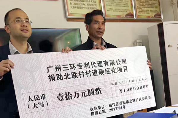 其间还进行了三环捐助北联村村道硬底化项目签字仪式。广州三环专利代理有限公司总经理郝传鑫代表三环出席了该仪式并签订捐建协议,向北联村捐出10万元人民币,用于村道改建工程,助力精准扶贫工作。