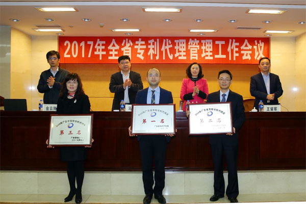 会议现场对2016年广东省发明专利代理量、PCT国际专利申请代理量前三名的代理机构进行了表彰,并颁发了铭牌。三环包揽了上述两个奖项的第一名。